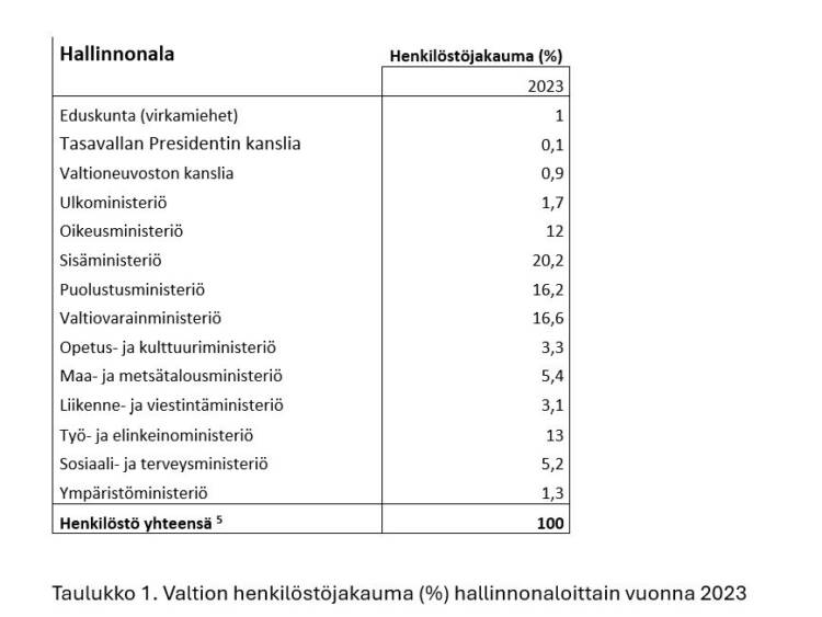 Taulukossa 1. on henkilöstöjakauma hallinnonaloittain.