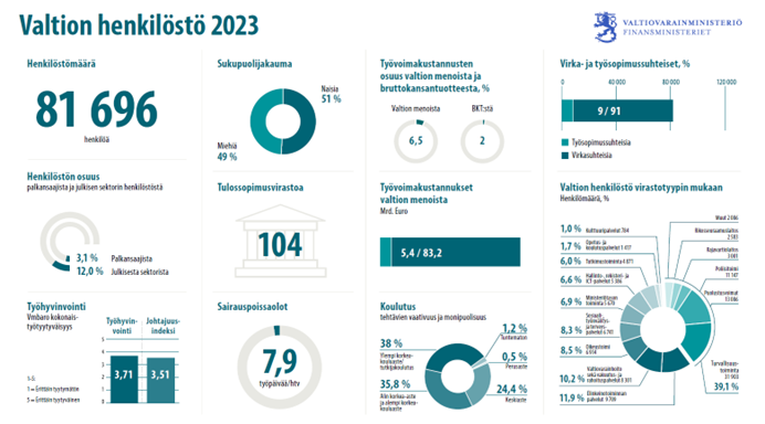 Valtio työllistää hieman alle 82 000 henkilöä, josta valtaosa työskentelee kokoaikaisesti, vain 4 % on osa-aikaisia. Määräaikaisia on 17 %, heistä pääosa toimii projekteissa tai sijaisina.